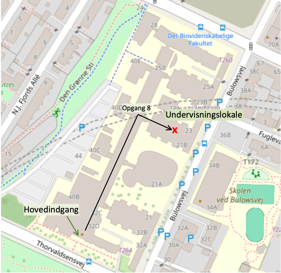 Vi har vores undervisningslokaler på Frederiksberg Campus, men vi kan være en smule svære at finde. Hovedindgangen til bygningen findes på adressen Thorvaldsensvej 40, 1871 Frederiksberg C, og er markeret på nedenstående kortet. Når I er kommet ind af hovedindgangen, skal I fortsætte ned af den lange gang, der findes i forlængelse af indgangen. Herfra skal I finde "Opgang 8", og gå ned af den til I når enden af opgangen. Her finder I vores lokaler og vores formidlere, der vil tage imod jer.